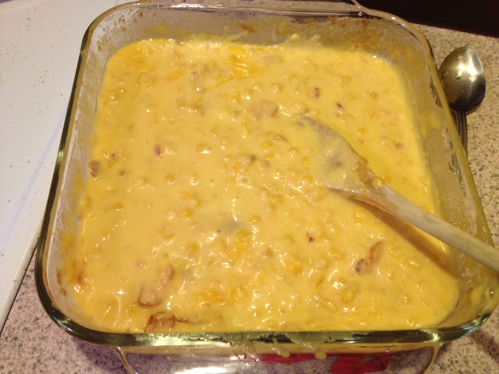 Pour corn mixture into a baking dish. Sprinkle remaining bacon over the top. Bake uncovered for 20-25 minutes.