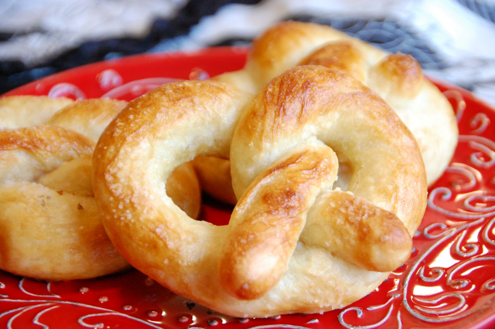 Punch dough down. Roll into log. Mark off into 12 portions, and cut. Roll each portion into 1/2 inch rope. Shape each rope into pretzel form on greased baking sheets. Beat egg white and 1 teaspoon water with fork in small bowl; brush glaze on pretzels. Sprinkle some pretzels with kosher salt, and some with sesame seeds.