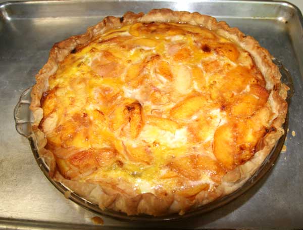 Arrange peach slices in bottom of pastry-lined pie pan. Pour custard mixture over peaches.