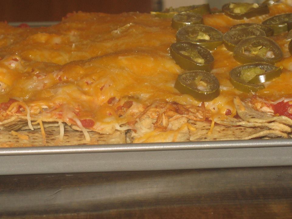On a cookie sheet line it with aluminum foil. Cover it with chips, then add your shredded chicken, salsa, cheese, jalapenos. Bake till cheese is melted at 400. I did this in the Electric Roaster Oven and bake it. You can do the same thing with this but in the regular oven. This is just how I did it without one.