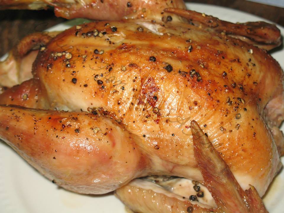 Take your chicken and put it in a pan rub it down with garlic oil. Then sprinkle it with salt. Then add your peppercorns to it. Next take your half stick of butter and drizzle it on top. You can also skip the butter if you want but I like it on there. Put it in the oven depending on the weight of your chicken. This was almost four lbs. I cook it at 350 for 3 or so hours. I take it out when the meat is cooked and the skin is a nice golden color.