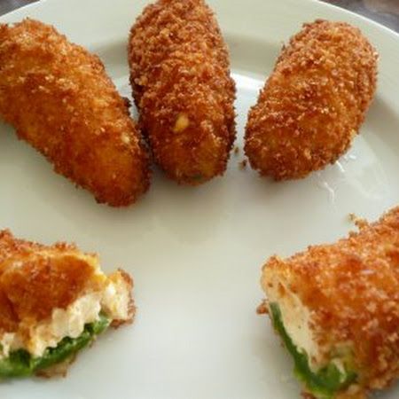 Put the milk and flour into two separate small bowls. Dip the stuffed jalapenos first into the milk then into the flour, making sure they are well coated with each. Allow the coated jalapenos to dry for about 10 minutes.