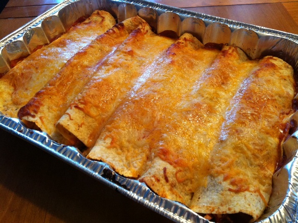 Roll even amounts of the mixture in the tortillas. Arrange in a 9x13 inch baking dish. Cover with taco sauce and 3/4 cup Cheddar cheese. Bake uncovered in the preheated oven 20 minutes. Cool 10 minutes before serving.