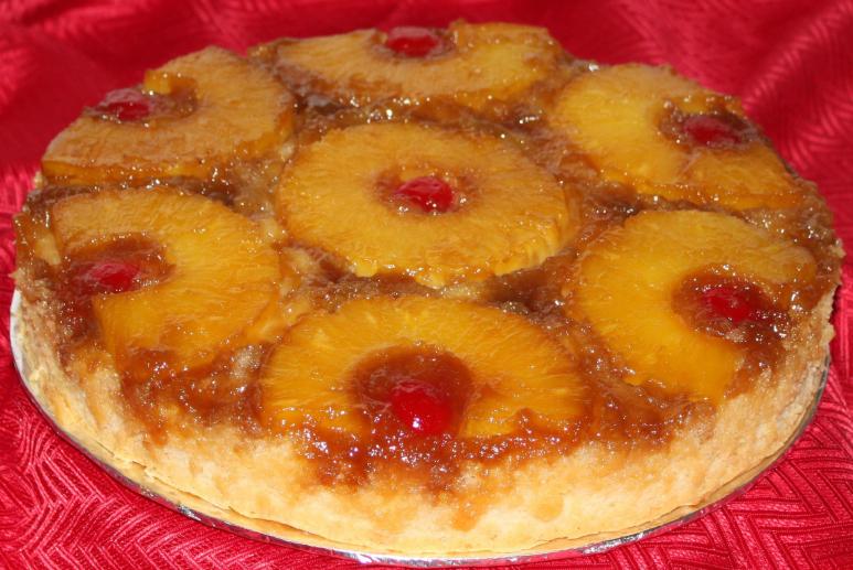 Loosen the cake from the skillet by running a knife around the inside edge of the cake. Invert a large plate over the top of the skillet and flip over, releasing the cake to show the pineapple slices on top.