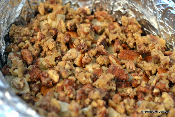 In a bowl combine brown sugar and cinnamon. Sprinkle half this mixture over the bread in the baking dish. Add the remaining bread.