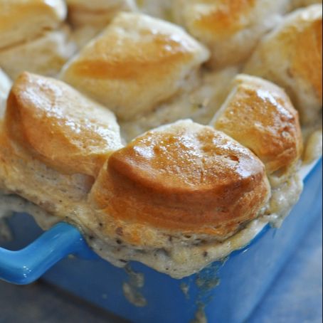 Layer the remaining uncooked, quartered biscuits over the gravy.