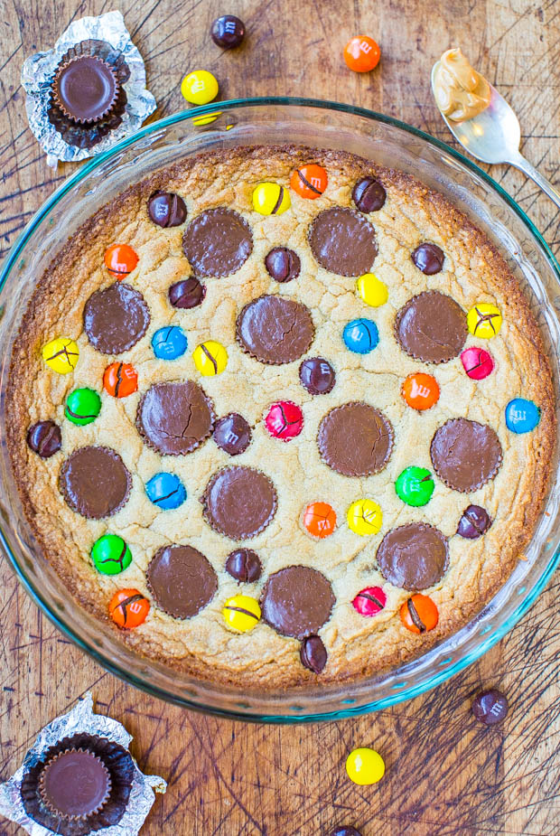 Bake for about 28 to 30 minutes, or until a toothpick inserted in the center comes out mostly clean, or with a few moist crumbs, but no batter. If your pie has risen in the center, it will deflate as it cools. Allow pie to cool in pan for at least 30 minutes before slicing and serving; however, for optimal results, cool overnight because it gives the flavors a chance to marry and the pie to really set up fully. Pie will keep airtight at room temperature for up to 1 week, or in the freezer for up to 6 months (color may leech from the M&Ms if you freeze it).