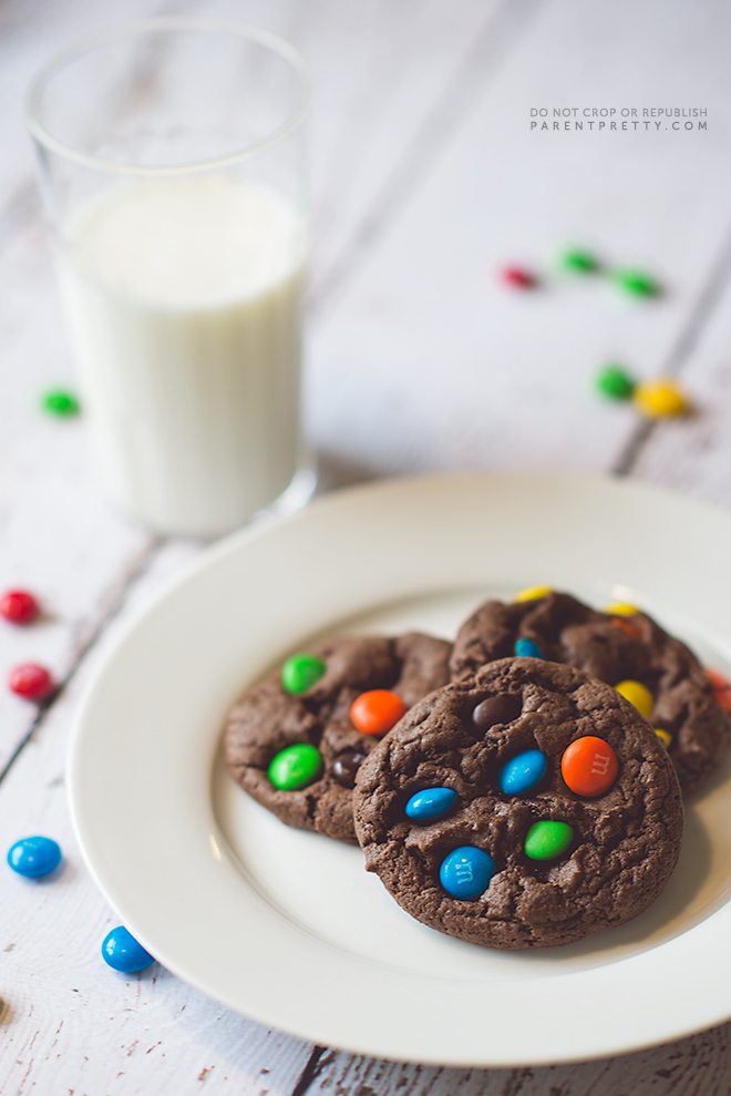 3. Add m&m's, about a half cup at a time, stirring in with a wooden spoon. Drop rounded tablespoons 2 inches apart onto an ungreased cookie sheet.