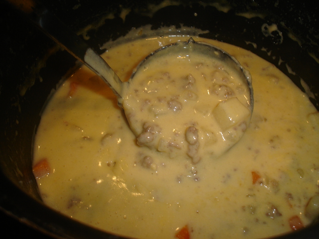 Add in the chicken stock, potatoes and beef and bring to a boil. Reduce heat, cover and simmer for 10-15 minutes or until potatoes are tender.
