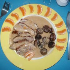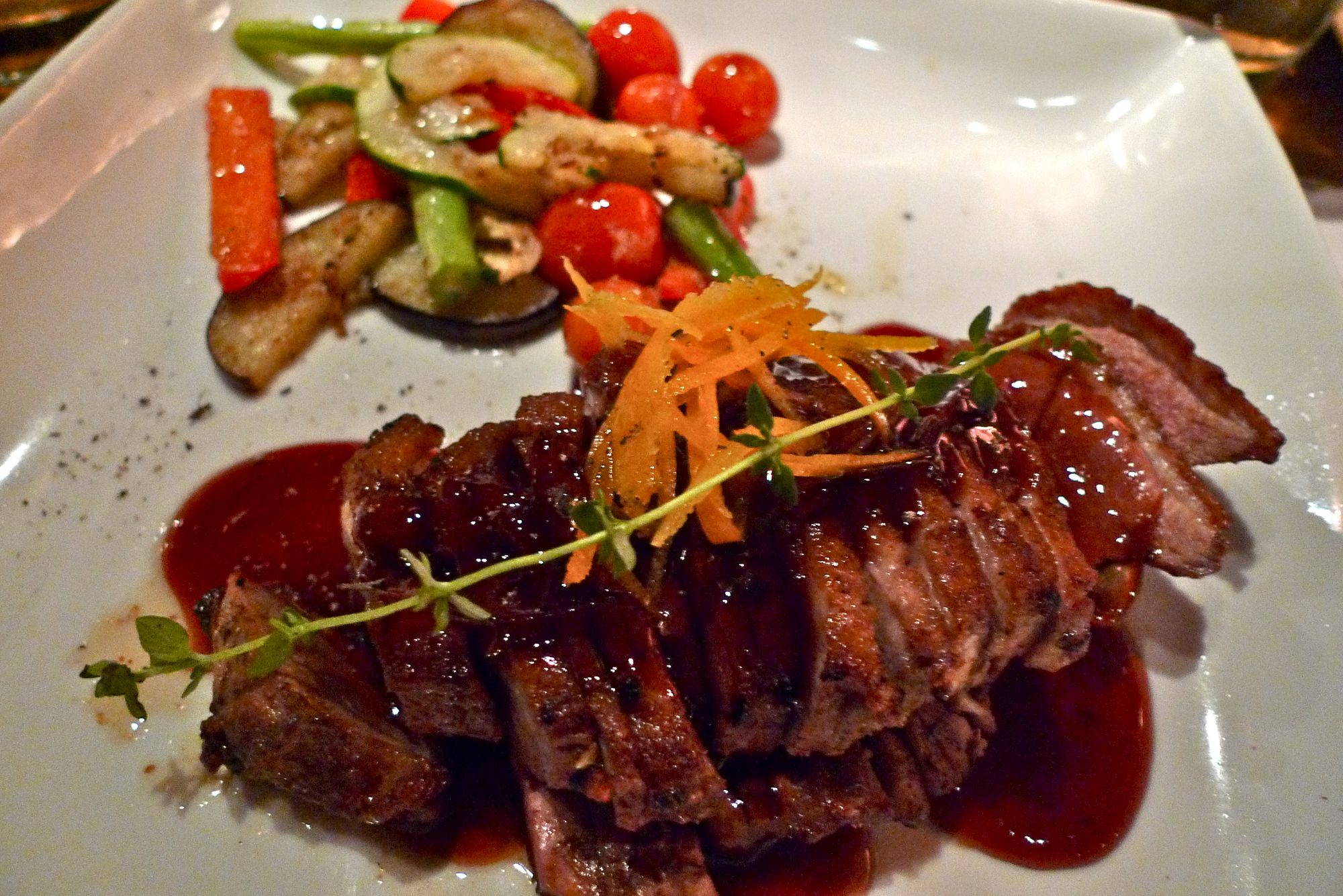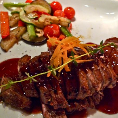 In a skillet, sear the duck breasts over high heat. Cook the duck for about 9-11 minutes on each side. Pour the prepared sauce over the duck breasts and garnish with the remaining orange zest.