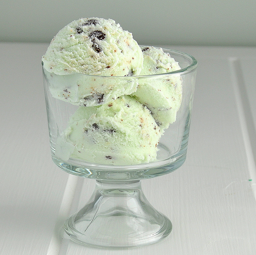 Pour the mixture into an ice cream maker, and freeze according to the manufacturer's instructions. After about 10 minutes into the freezing, add the chocolate chips. After the ice cream has thickened, about 30 minutes later, spoon into a container, and freeze for 2 hours.