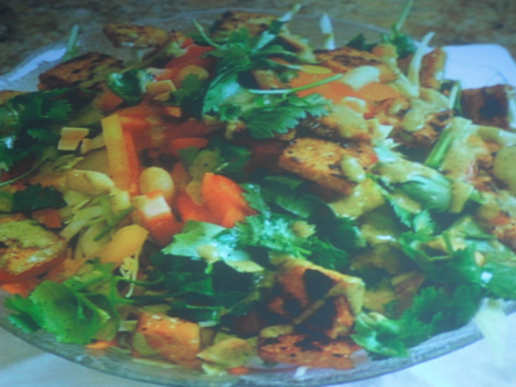 This salad is full of Thai flavors, such as, peanut butter and coconut milk. Tofu is used as the "meat".