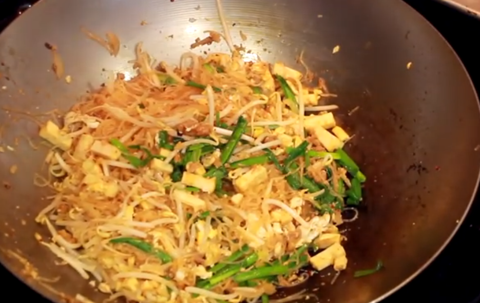 Quickly dump the softened noodles into the wok. Toss quickly and constantly in the sauce.
