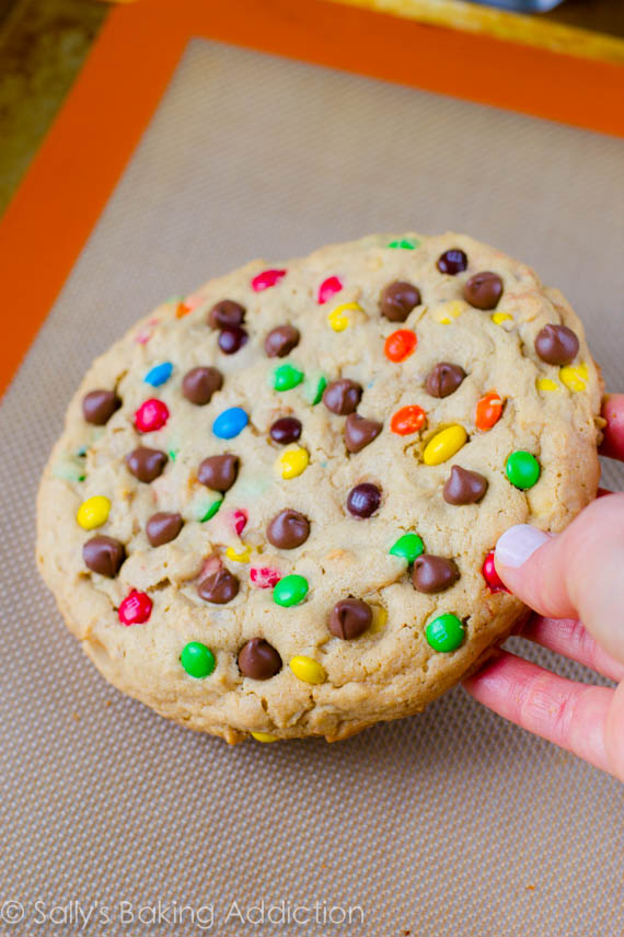 In a large mixing bowl, whisk the butter and sugars until creamed. Add egg and vanilla mixing until well combined. Stir in peanut butter then add flour, oats, baking soda and salt. Fold in M&Ms until combined. With a large spoon, scoop into a ball onto prepared baking sheet. The dough will be sticky. Make sure the cookie dough ball is tall and round. Press the chocolate chips into the top of the cookie.