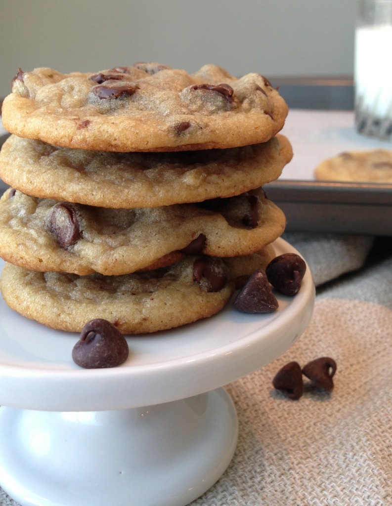 Cream butter and sugars until light and fluffy. Mix in egg and vanilla until completely incorporated. Add flour mixture in 3 additions; scraping down the bowl after each addition. Mix in chocolate chips.