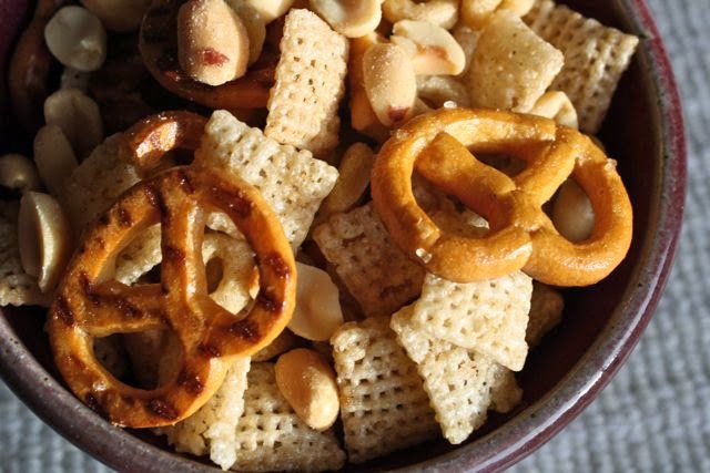 Mix cereals, pretzels, cheese crackers and mixed nuts in a large turkey roaster.