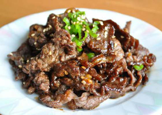 Place beef in shallow dish, cover with soy sauce, green onion, sugar, garlic, sesame seeds, sesame oil, ground black pepper. Cover and refrigerate for 1 hr or overnight.