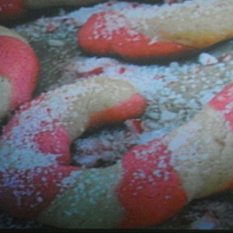Preheat oven 375*F. Bake 9 minutes. Sprinkle cooked cookies with sugar and crushed candy cane.