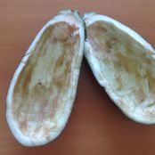 Cut your eggplant in half and scoop out the flesh but leave the outside intact. I boiled the two halves in water for a little over 5 minutes (because I was feeling impatient and didn't want to bake it 40 minutes). Chop up the eggplant insides and boil in same water until soft. Drain.