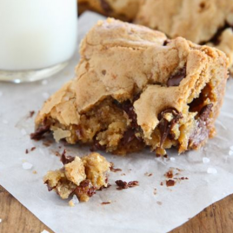 Divide the cookie dough in half. Press half of the cookie dough into the prepared pan, smoothing the top with the spatula. Pour hot caramel over the cookie dough. Sprinkle caramel with sea salt. Drop spoonfuls of cookie dough over the caramel and spread dough with a spatula until the caramel is covered. Sprinkle the bars with additional sea salt.