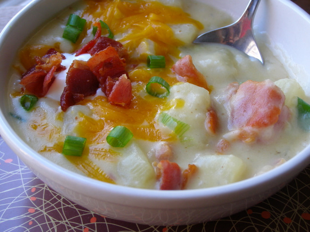 Top with Cheddar, green onions, crumbled bacon and extra sour cream if desired