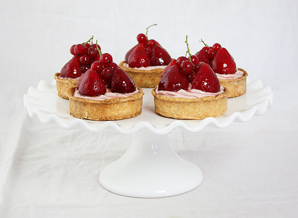4.In a large bowl of an electric mixer or in the food processor, combine sour cream, cream cheese, lemon zest, lemon juice, vanilla extract, egg, and sugar. Beat on medium high speed (or pulse) until the mixture is smooth. Divide the batter evenly among the prepared tart pans.