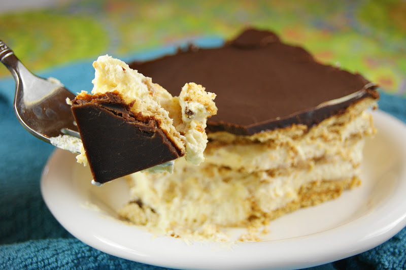 Top all with a final layer of graham crackers and frost with chocolate frosting. Refrigerate at least two hours before serving to allow the graham crackers to soften.