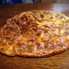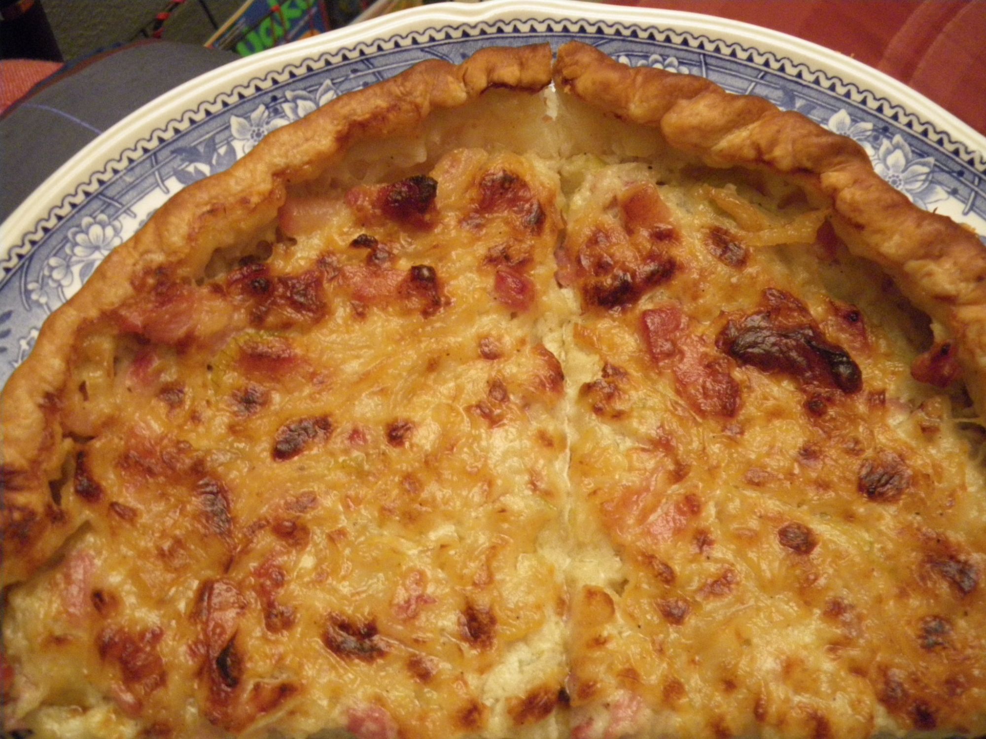 -Peel the onions about 3 1/3 lbs. Sauté with the bacon and mix with sour cream and 4 oz of cheese. -Roll out the dough into a pie pan or tart pan with more cheese.