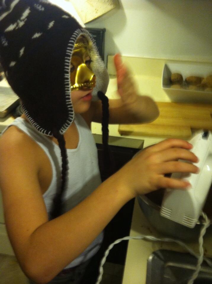 Mix all ingredients together in a bowl EXCEPT THE FRUIT. That is your garnish to top your pancakes! You can use a hand mixer like Elliot is doing in the picture. Make sure all the flour and ingredients is well mixed.
