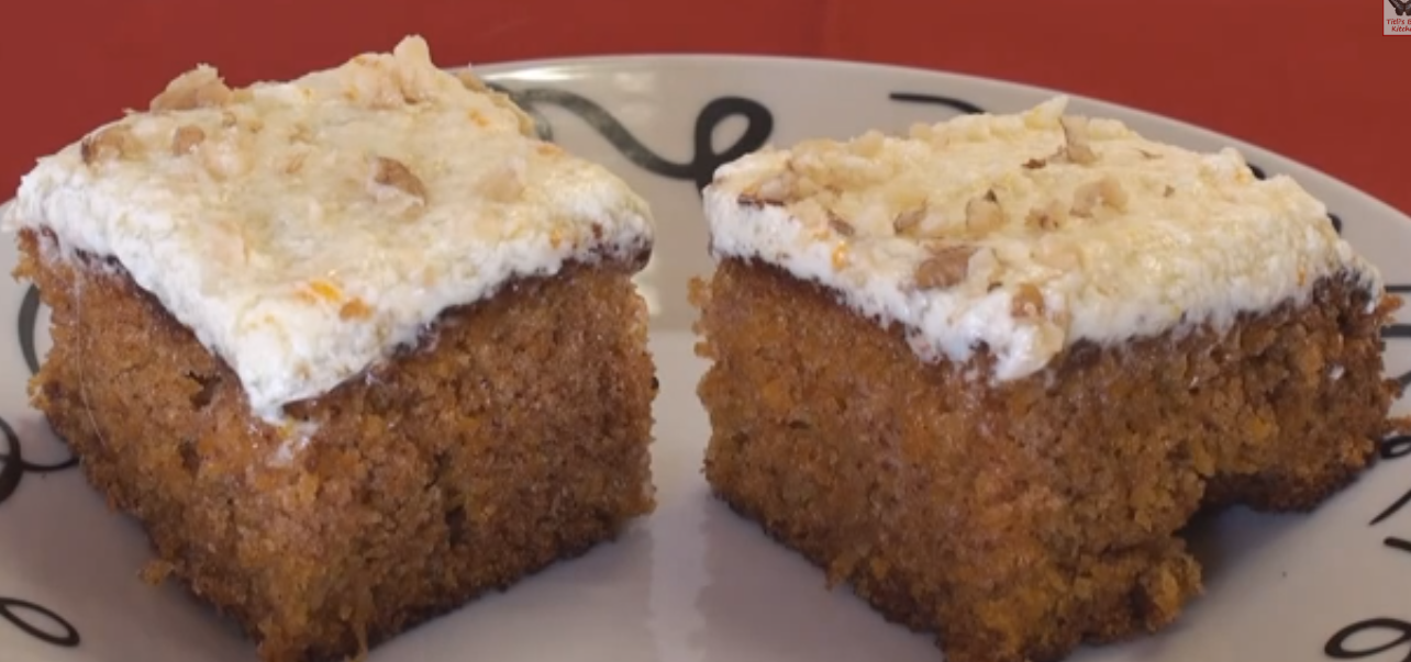 Pour batter in prepared cake pan and bake for 45 to 50 minutes. Test for doneness by inserting a toothpick, it should be dry when taken out. Cool then fill and frost with cream cheese frosting. Garnish with more nuts.