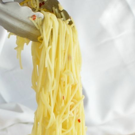 Pour pasta in Large bowl with lid, Add garlic and oil, Mix well. Store in refrigerator.