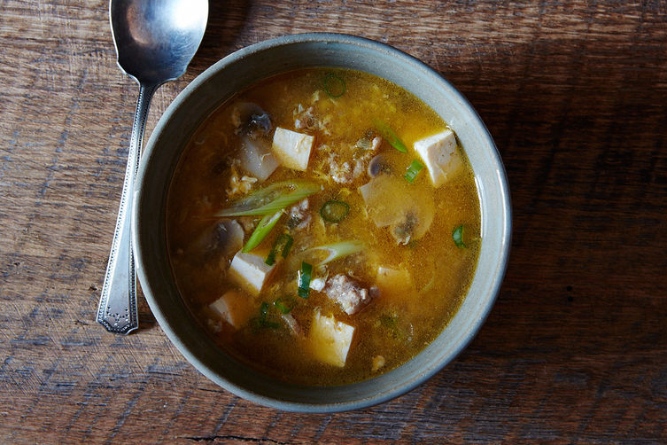 Stir in soy sauce, sugar, salt, white pepper, and vinegar. Combine cornstarch with 3 tablespoons water. Add a little of the hot soup to the cornstarch, and then return all to the pan. Heat to boiling, stirring. Add the bean curd, and cook 1 to 2 minutes.