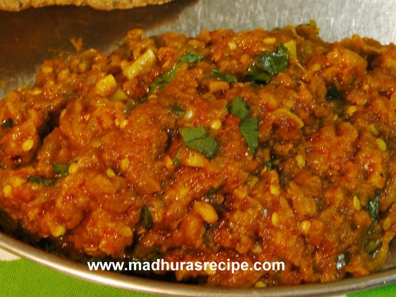 5) Once the eggplant has cooled to touch,peel off the charred skin, and mix the eggplant well with a fork,before adding to pan.Add the eggplant,green peas (optional), coriander leaves, salt. If needed add 1/2 cup water to mix everything well. Cook for 3-4 minutes more,mixing well in between.