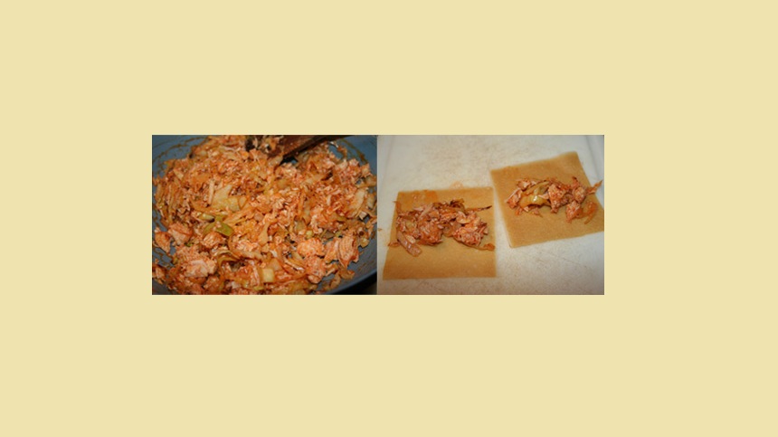Take coconut wraps and cut them in fourths or small lettuce leaves and fill them with a tablespoon or two of the chicken mixture.