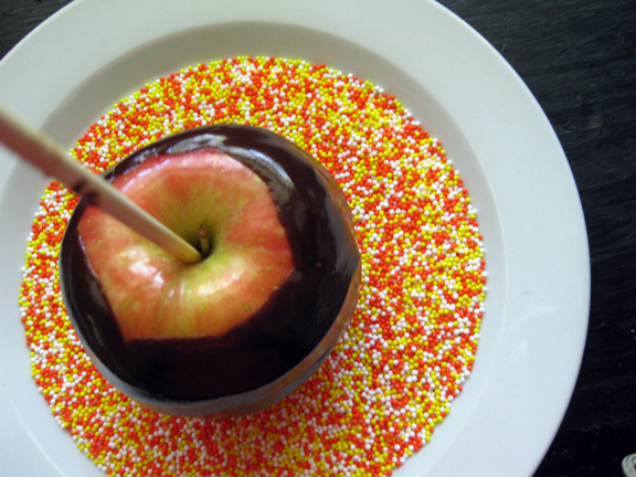 7. Place about 1 cup sprinkles (your choice of color) on a plate. Roll bottom third of each apple in sprinkles to coat. Refrigerate until chocolate is firm, about 15 minutes.