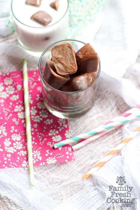 2. Place 4 chocolate ice cubes in each of 6 glasses; add 2/3 cup milk to each glass.