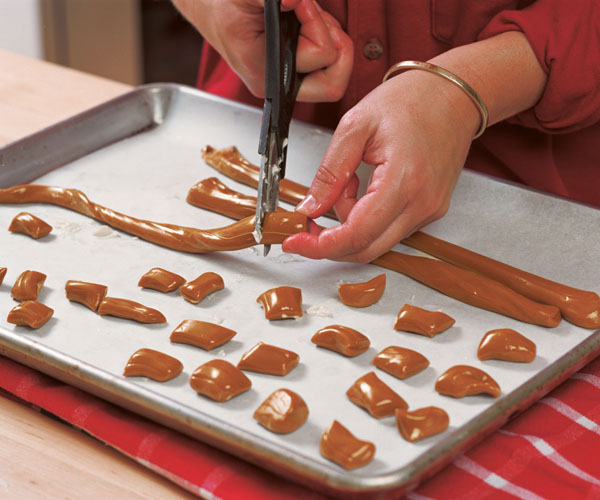 Once able to pick up from pan,twist and pull taffy on a buttered hook that's outside. Use butter as needed to pull the taffy. Pull until hard. The color of the taffy should look like a shade of light blonde. Then bring pulled taffy inside to cut into pieces. Wrap pieces with wax paper.