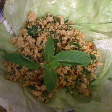 Laab is generally a healthy dish, since it is made with the leanest parts of the meat. My version is even healthier because it's made with baked chicken breasts and the rest of the ingredients are pretty low in calories as well. Laab is meant to be eaten room temperature or even cold and served with greens such as lettuce and of course rice.