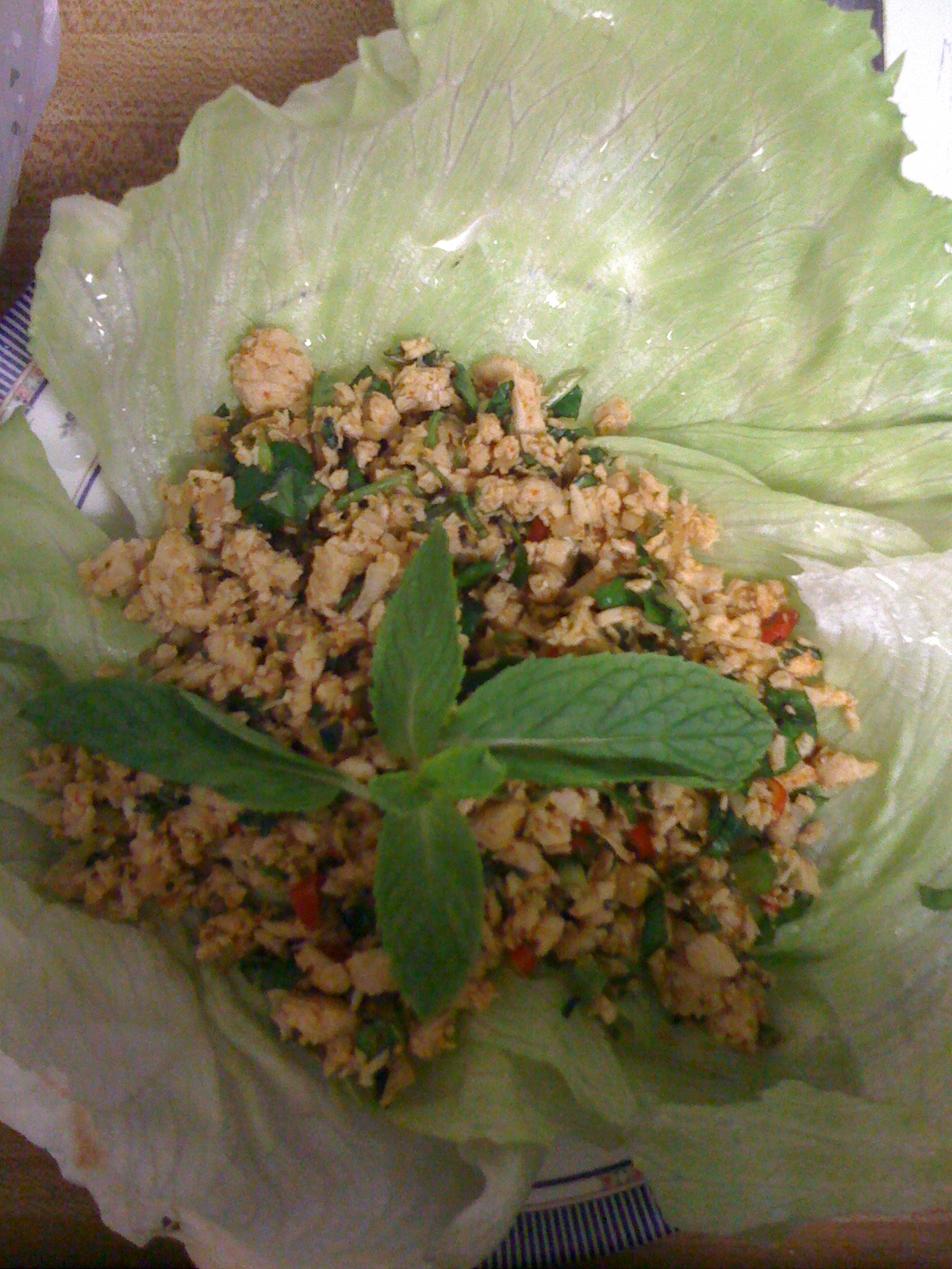 5. Put laab on a serving plate on top of some lettuce as presentation. Serve with an additional side of lettuce and a bowl of rice.