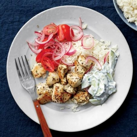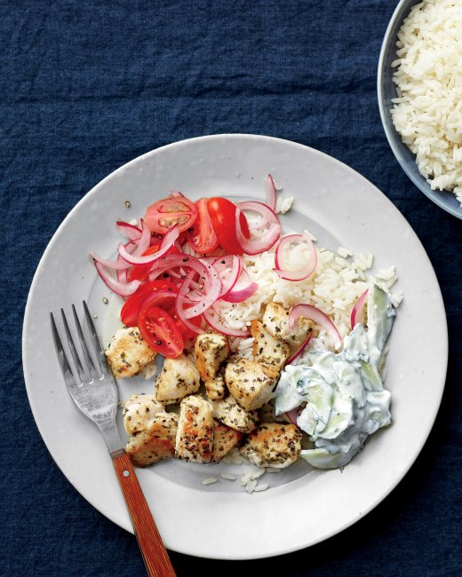 In a large nonstick skillet, heat oil over medium-high. Add chicken and cook until golden brown and cooked through, about 10 minutes. Add tomatoes to pickled onions and serve with chicken, tzatziki, and rice.