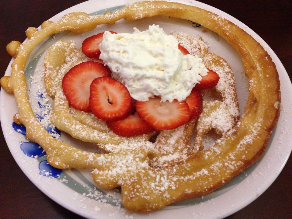 Let the funnel cake mixture rest for about 10 minutes. Pour the batter into a liquid measuring cup to make it easier to pour into the funnel. Prepare your desired topping while waiting like slicing strawberries, etc)