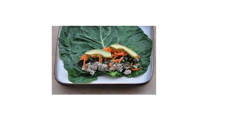 To assemble the wrap, place a green onto a large plate or cutting board. Place a few scoops of the filling on the bottom (stem-end) of the green.