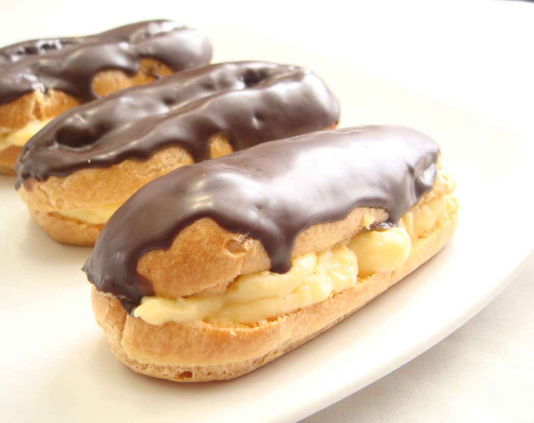 Fit a piping bag with a 1 cm ( 1/2 inch) plain nozzle. Fill the bag with the pastry. Pipe twelve 10 cm (4 inch) lengths on to a greased baking sheet. Bake at 200 °C / 400 °F / Gas 6 for 10 minutes. Reduce the temperature to 180 °C / 350 °F / Gas 4. Bake for a further 20-25 minutes until they are well puffed and golden. Remove from the oven and make a slit in the side of each one. Return to the oven for a further 5 minutes to dry out. Cool on a wire cooling rack.