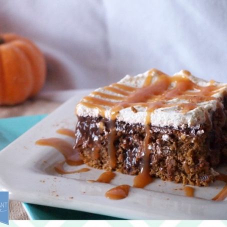 7.Remove cake from refrigerator and spread cool whip over top of cake. Sprinkle on the heath bits, and drizzle caramel over top. (note: if you want it less sweet you can use less of the jar)