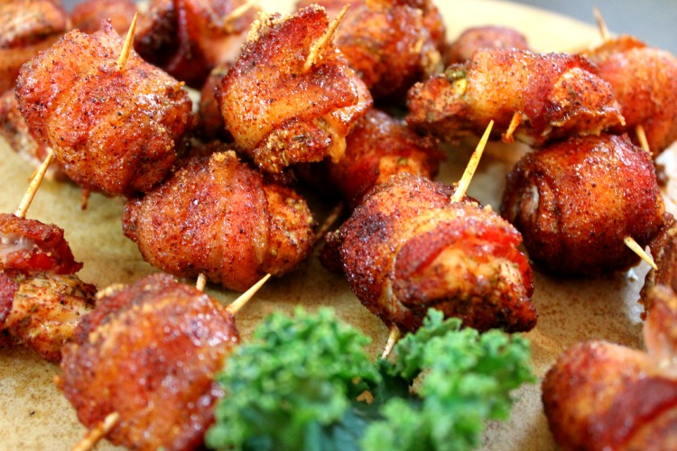 Cut each bacon slice into thirds. Wrap each chicken cube with bacon and secure with a wooden pick inserted on the diagonal starting where bacon seam overlaps.