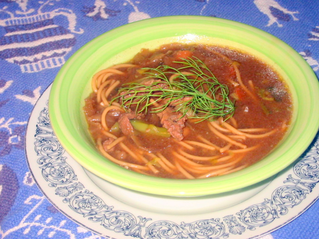 2. saute the celery and onion and carrot in large stockpot or wok in the oil. add the garlic, simmer until vegetables are soft. add the beef stock. bring to a slow boil. to serve, add the noodles and bean sprouts. Add the raw slices of beef just before service. serve with the soy sauce as a side.