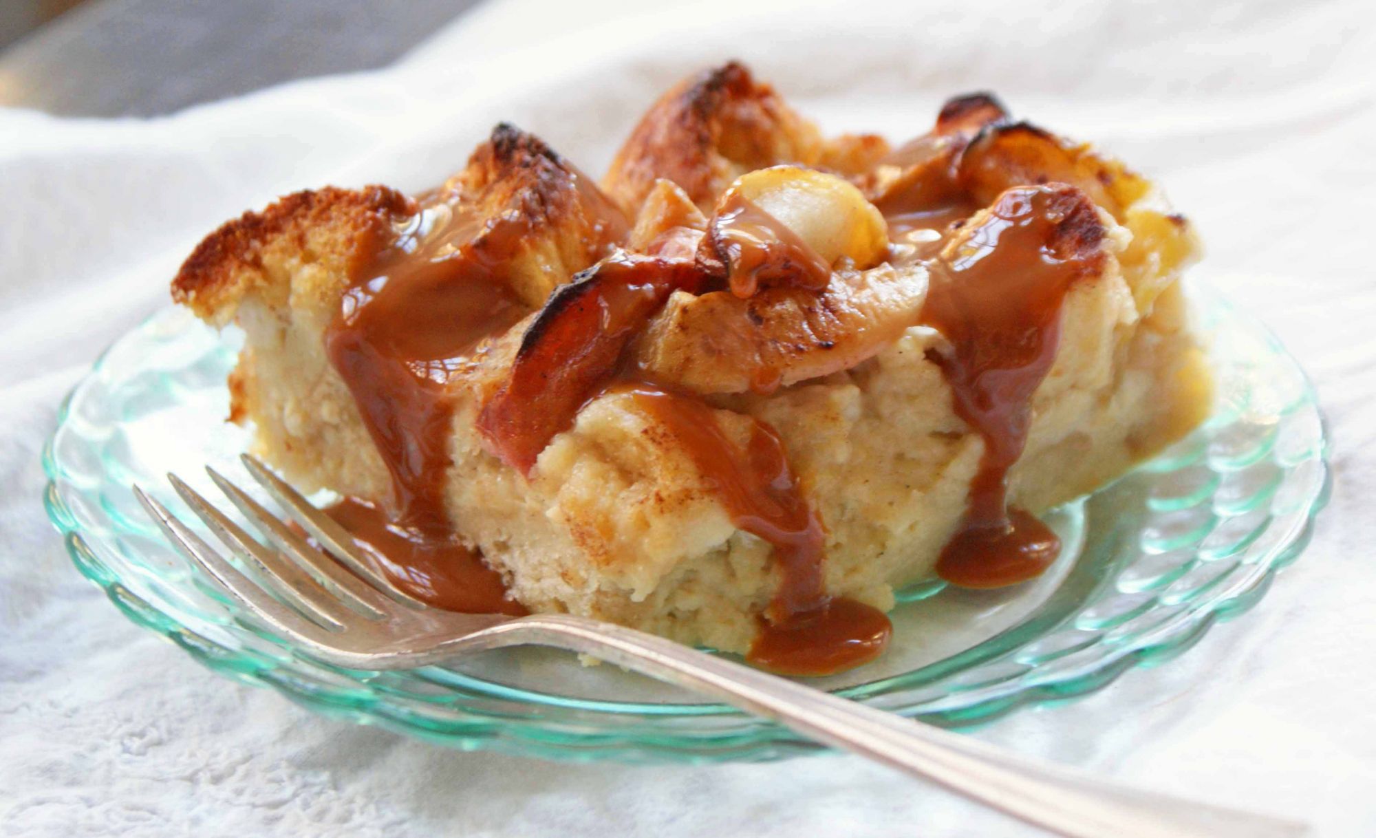 Butter a 9×13-inch pan or baking dish or spray it with nonstick spray. Pour in the bread mixture and spread the apples overtop, stirring them into the bread mixture slightly. Bake for 40 minutes, until puffed and golden. Serve warm (preferably with ice cream), at room temperature or cold, plain or drizzled with caramel sauce. Serves 10.