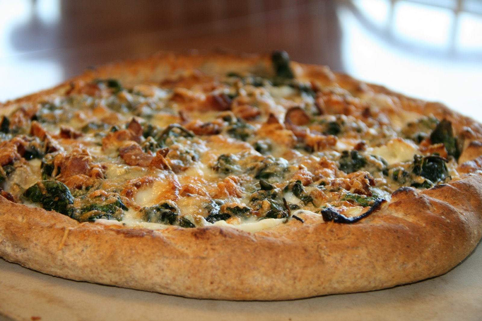 Top the par-baked pizza dough with the spinach mixture then top that with the feta and mozzarella.