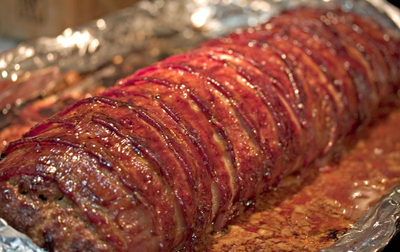 In a large bowl, combine all the meatloaf ingredients and mix well. Press the mixture into a 9 by 5-inch loaf pan. Bake for 30 minutes. Remove from the oven and brush some of the glaze over the top of the meatloaf.* if you are going to use the bacon version instead of a meatloaf pan I roll the meatloaf into a long roll & place on a baking pan covered in tin foil then carefully wrap the roll with one strip after another until covered Bake for 30 minutes more. Remove from oven and let stand for 5 minutes. Turn the meatloaf out onto a serving platter and spoon the remaining glaze over the top before serving.