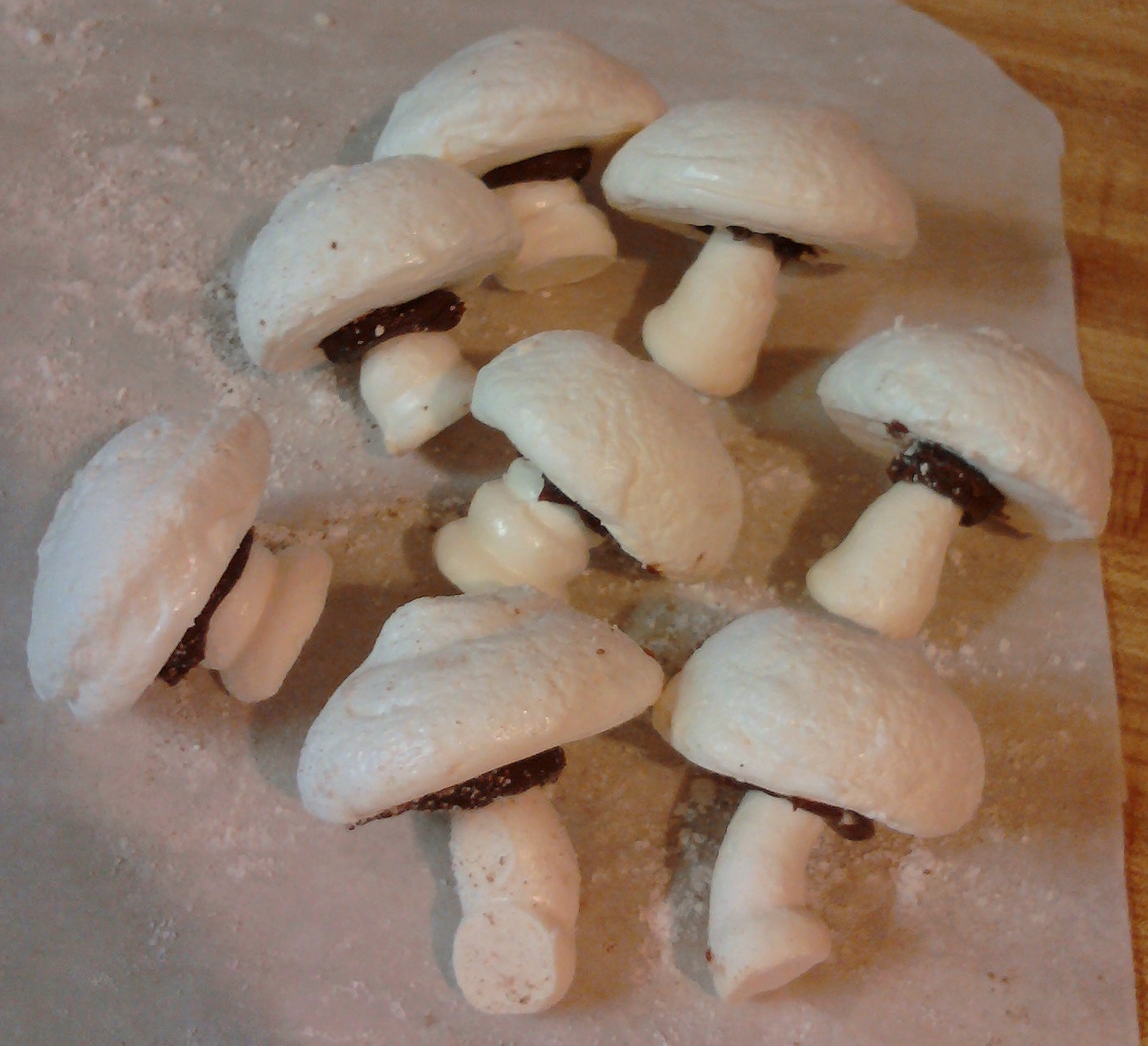 First, pipe the mushroom caps: hold the pastry bag at a 90-degree angle about 1/2 inch from the parchment paper. Using firm and even pressure, squeeze out a round meringue disc about 2 inches in diameter and 1 inch high. Stop squeezing, then twist the bag and lift it from the meringue to get a clean “break” from the cap. Repeat in regular intervals on the baking sheet until you have approximately 2 dozen mushroom caps. You can smooth out the tops of your mushrooms by wetting your index finger and lightly running it along the caps.